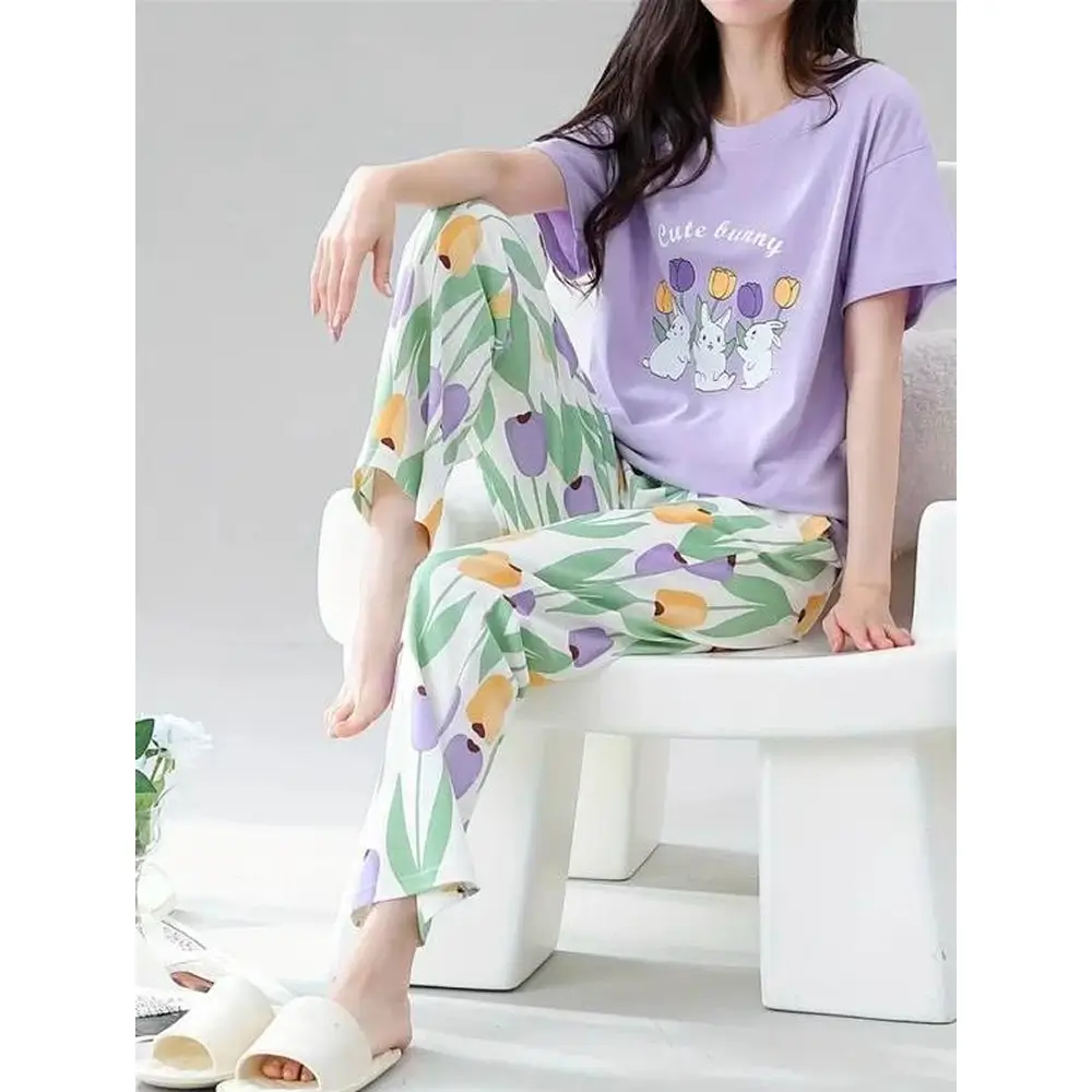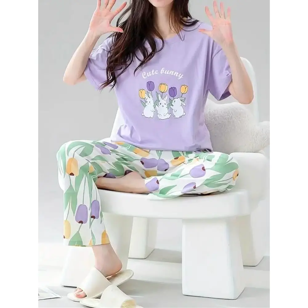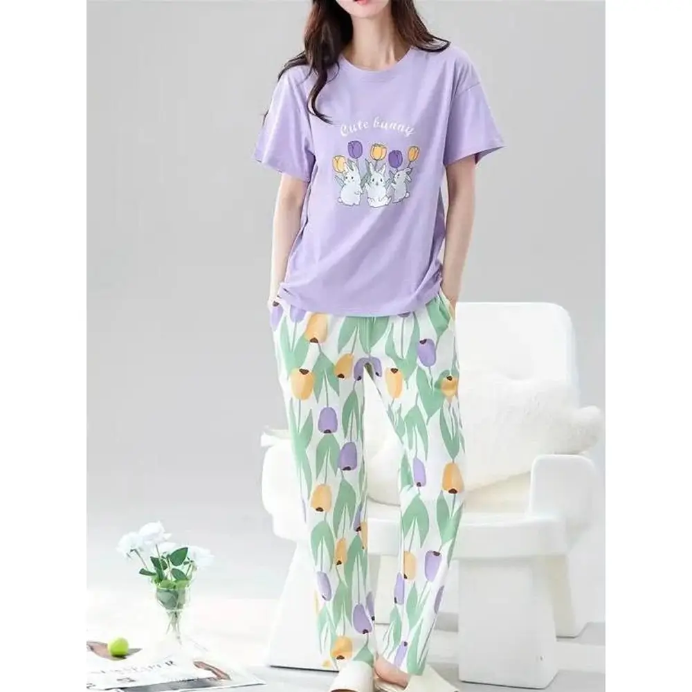 Relax in style with this adorable Cute Bunny Nightwear Set, designed for ultimate comfort and a playful look. The soft lavender t-shirt paired with beautifully printed pajama pants makes it perfect for cozy nights, lazy mornings, and all-day lounging. Light, breathable, and irresistibly cute — this set is a must-have for your nightwear collection.